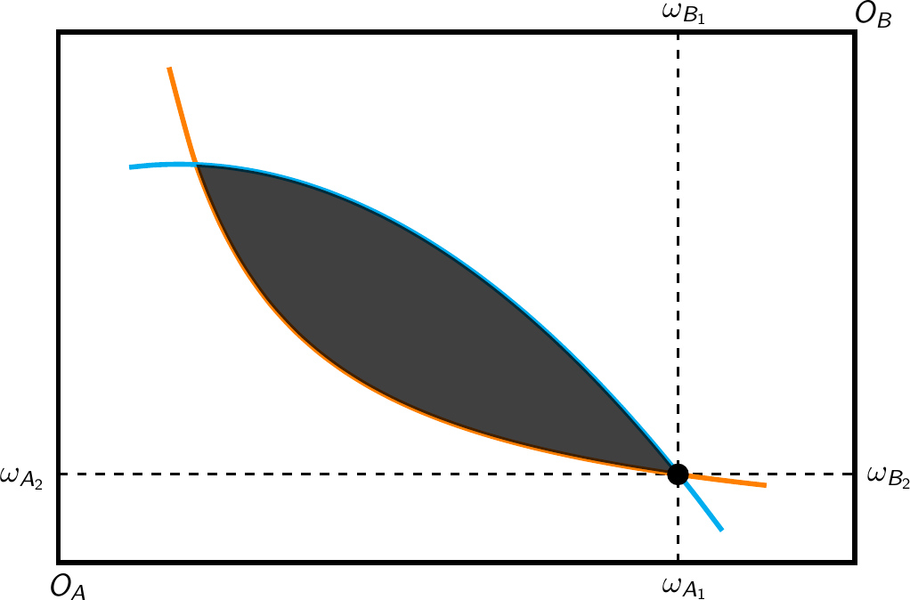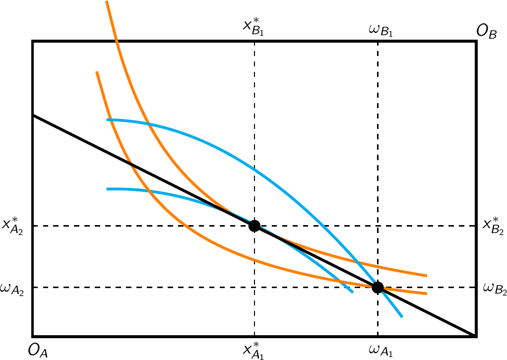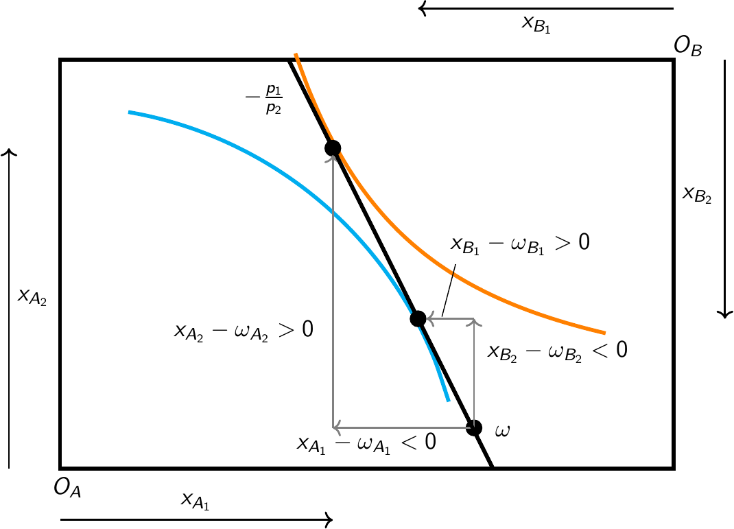 Die Budgetgeraden von \(A\) und \(B\) schneiden die Ausstattung und haben eine Steigung von \(-p_1/p_2\) (aus \(A\)’s Perspektive)
