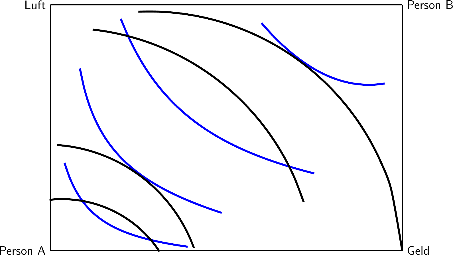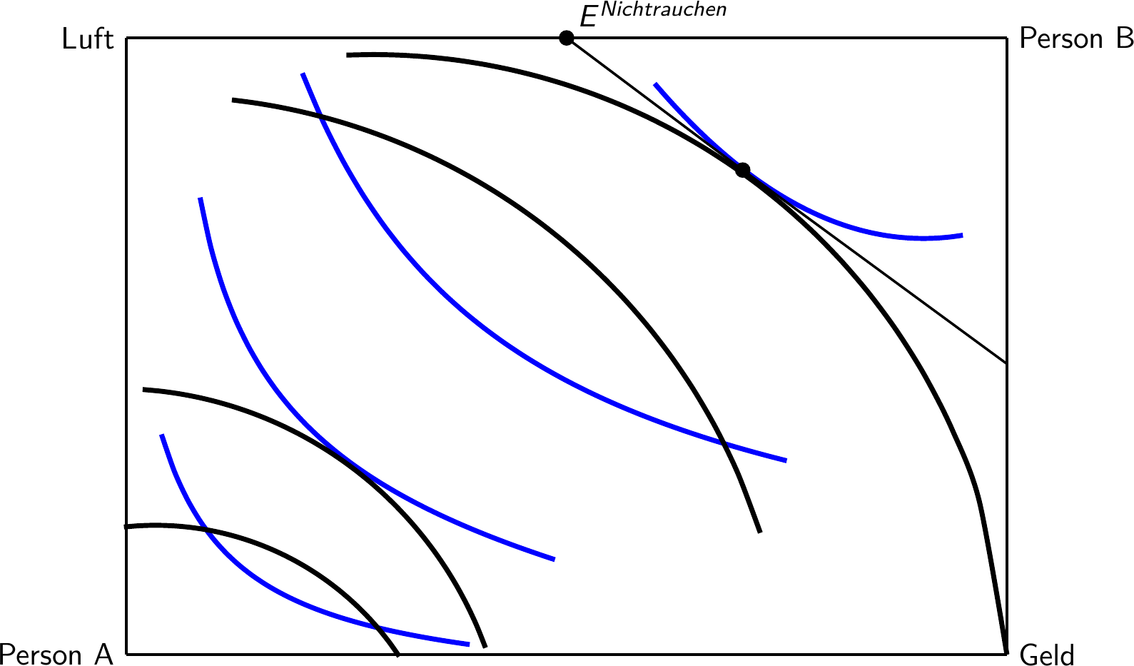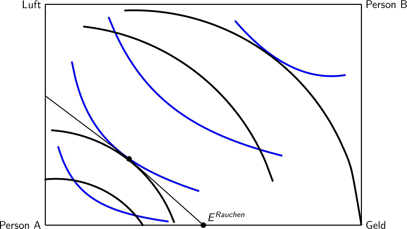 Person A ist Nichtraucher und schätzt sowohl Geld als auch saubere Luft (blaue Indifferenzkurven)